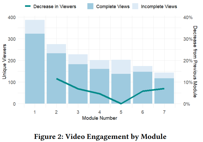 A graph of EdX Course Engagement, showing complete retention during the math portions of the course (Modules 4-5).